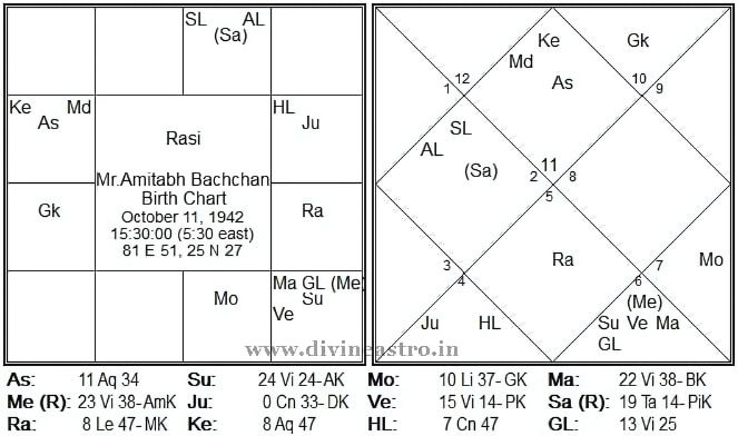 Amitabh Bachchan was born on October 11, 1942, placing him under the Libra zodiac sign (Tula Rashi). Librans are known for their charm, creativity, and balanced approach to life, traits that are clearly reflected in Bachchan’s persona. His birth chart is rich with powerful planetary alignments and yogas that have contributed to his unparalleled success in the film industry.